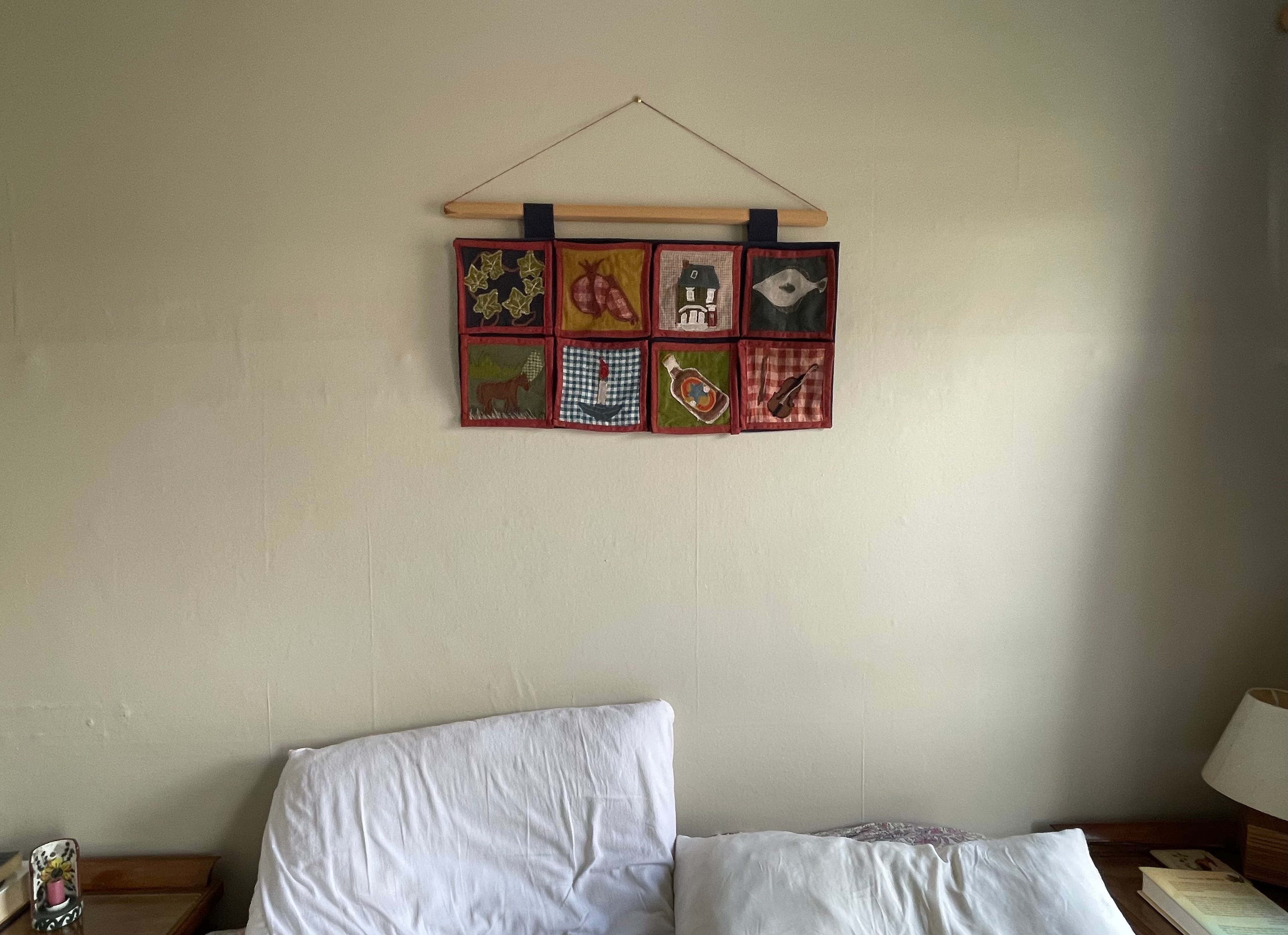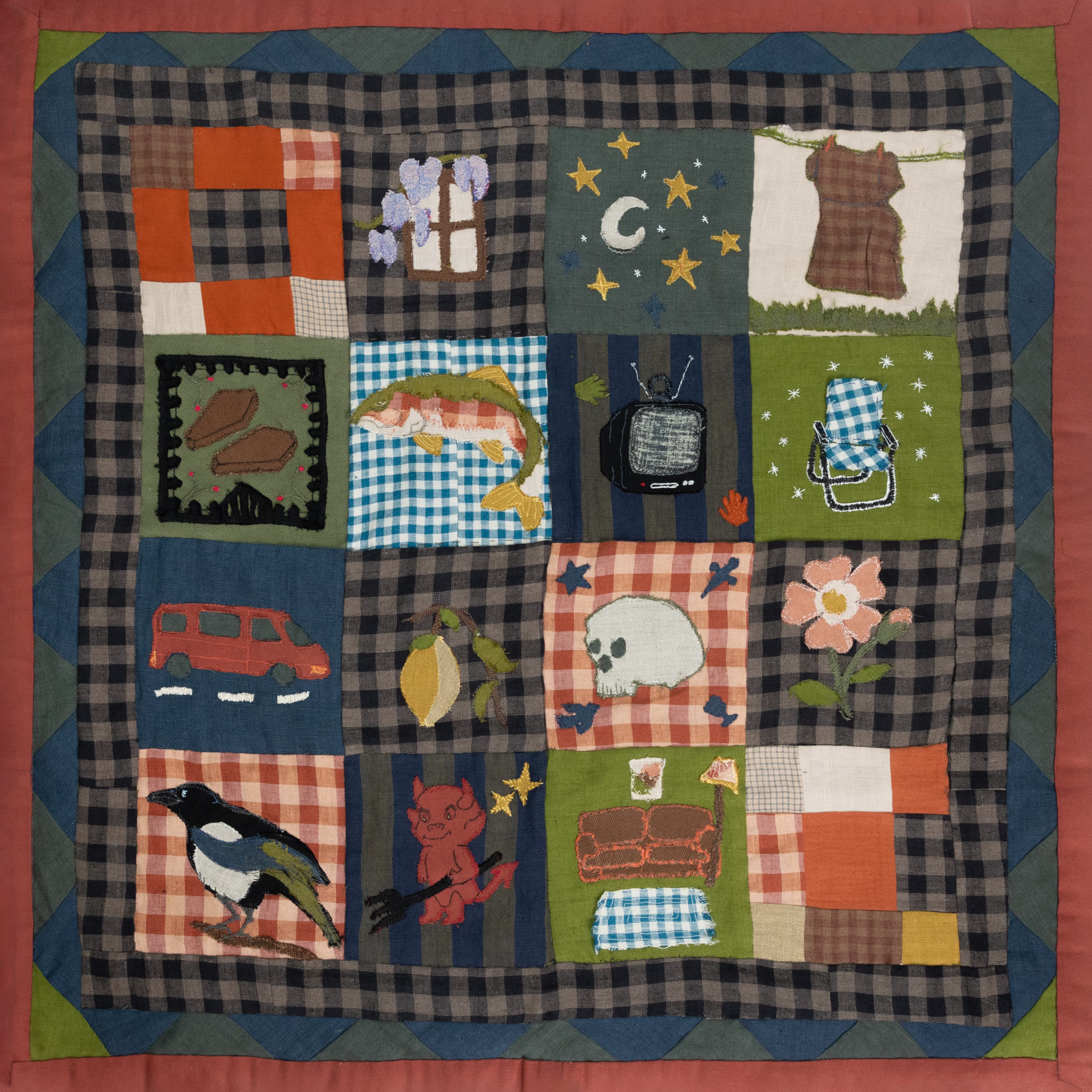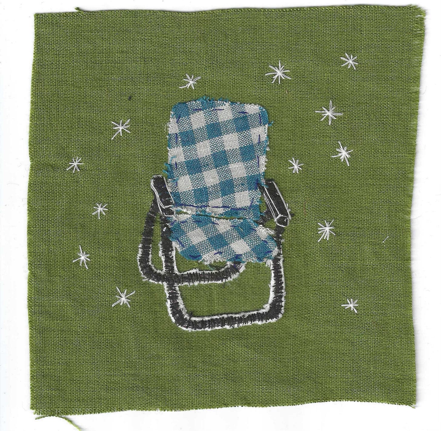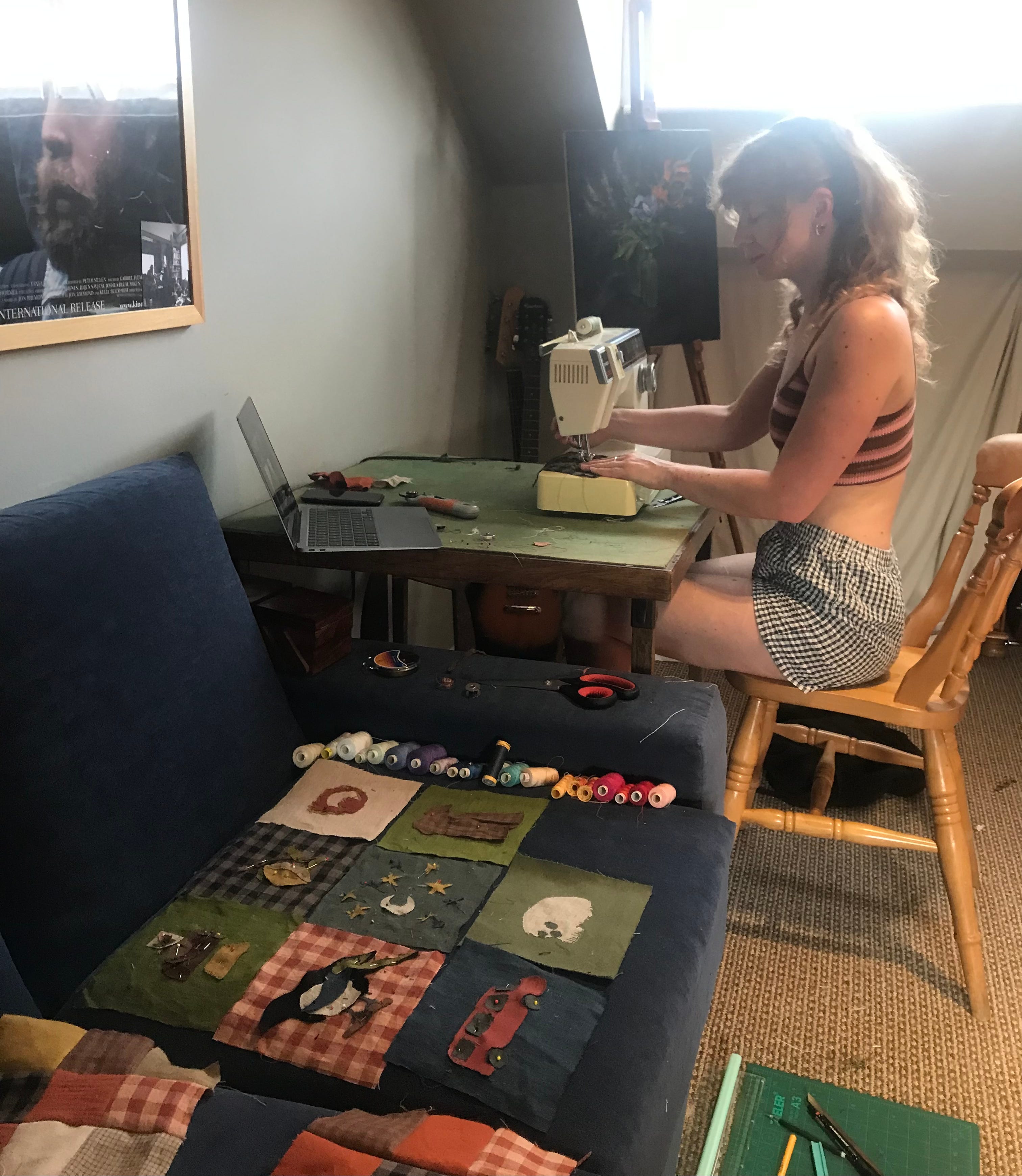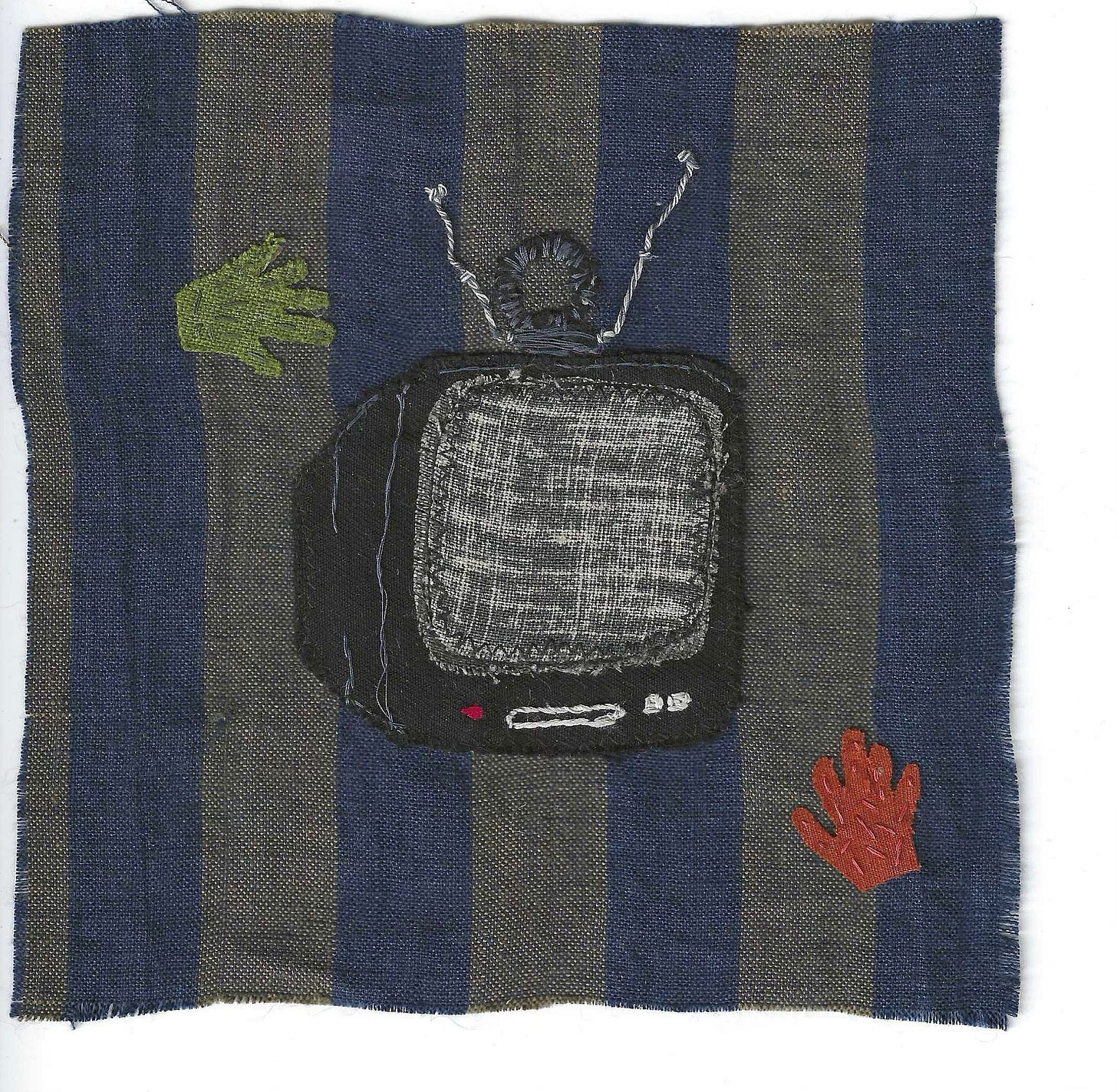 I’m not a perfectionist, so using too-big scissors to cut out shapes and ramming too many layers of fabric through the feed dogs of a sewing machine led to a bunch of happy accidents and unexpected outcomes which I enjoyed. A heavily employed zigzag stitch around the edges of most layers made sure nothing looks too neat, and an inherited cache of different coloured threads helped draw in details with a straight stitch with the occasional bit of hand sewing. Seeing some very of-our-time objects like the TV and lawnchair rendered in this time-worn tradition is pretty fun, it feels like they should look out of place but I don’t think they do.