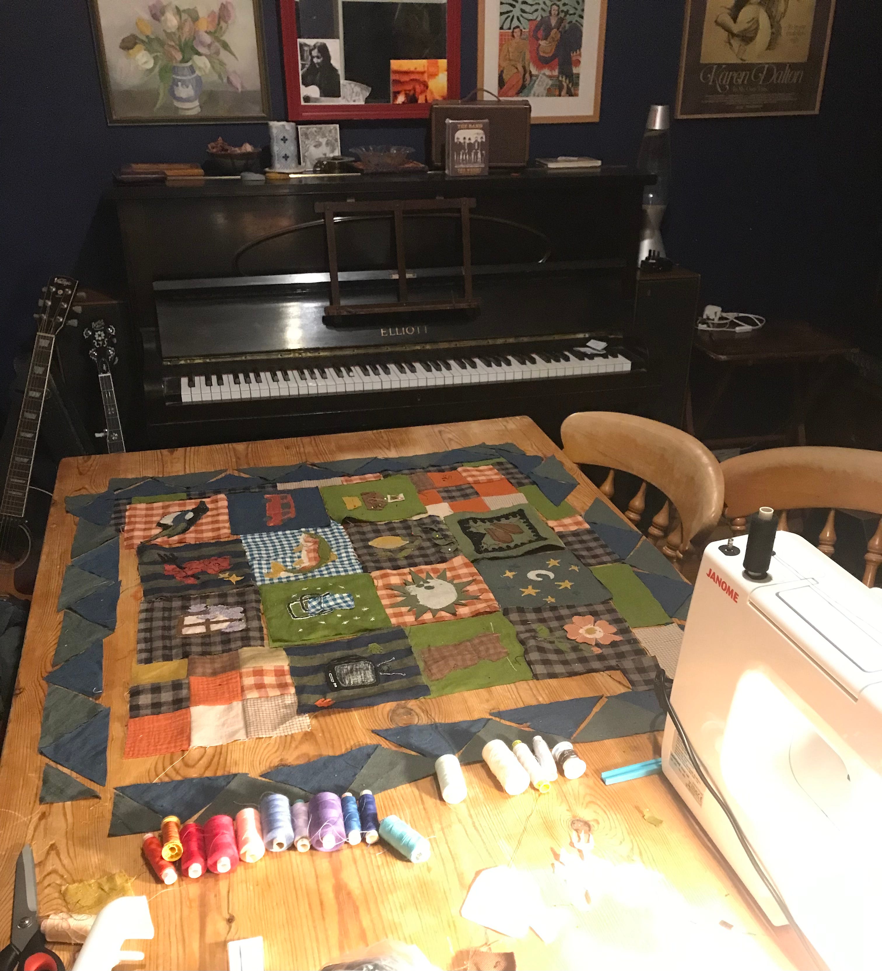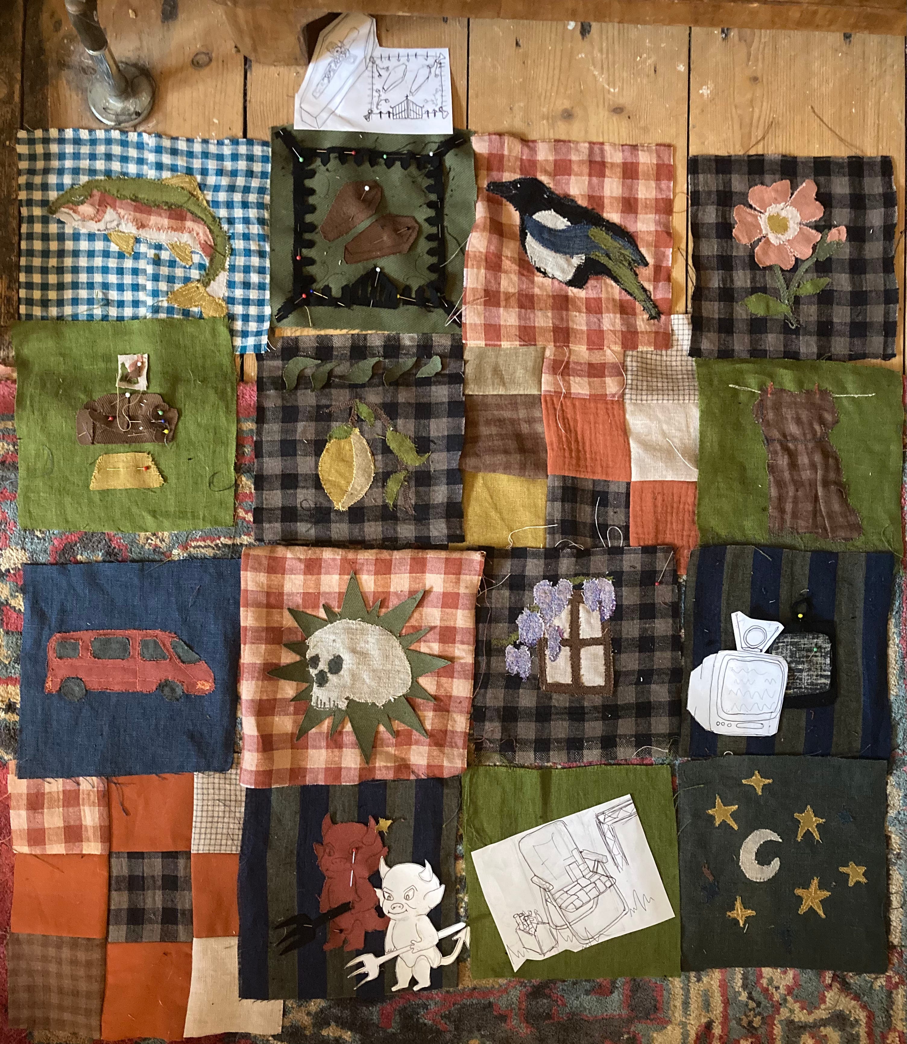 ATRW is full of imagery and five of us contributed songs to the album, so representing the album as a patchwork quilt of motifs just made sense. So I put to good use some of what I’d been learning. I had a good time re-reading all the lyrics and sketching flash sheets of ideas for the blocks (which I cut up to trace around or literally sew over, which is a shame as looking back these would’ve been a cool lil artefact of the process).